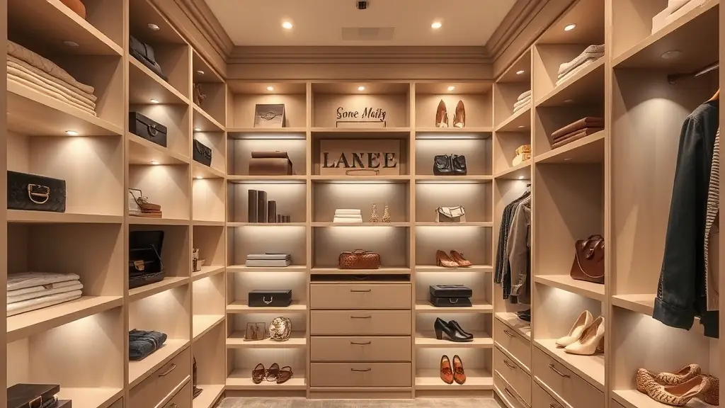 - Elegant walk-in closets with custom shelving and lighting